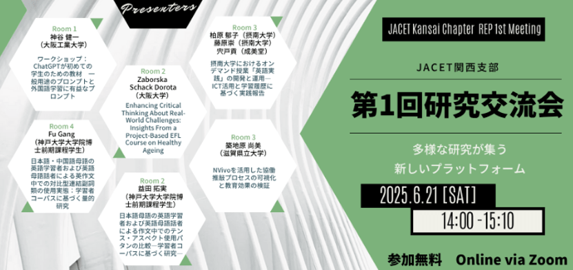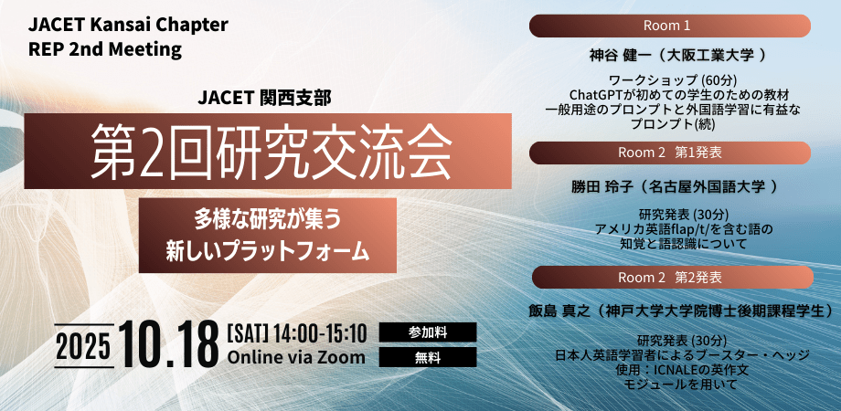 JACET Kansai Chapter has launched the Research Exchange Platform (REP) starting in the 2025 academic year to further invigorate chapter research activities. While research fields are increasingly specialized and refined, REP aims to create a space where members can freely present and share the outcomes of their daily research and educational practices, with “diversity” as its key concept. We hope this will become a vibrant platform gathering diverse research across the above perspectives. We look forward to receiving active submissions from our members.