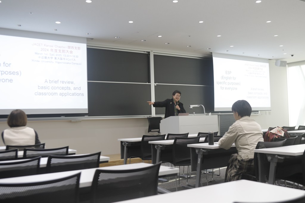 The second keynote speech was delivered by Professor Emerita Judy Noguchi (Kobe Gakuin University), titled “ESP for everyone: a brief review, basic concepts, and classroom applications,” which explored key ideas in ESP and practical ways to implement them in classroom settings.