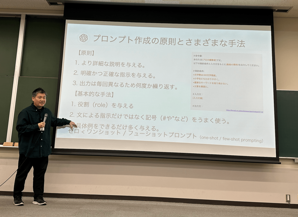 基調講演では、水本篤先生(関西大学)より、「プロンプトエンジニアリングで変わる英語教育実践と研究」と題して、豊富な具体例やご自身の研究成果を惜しみなく披露して頂きました。AIとの協働というキーワードのもと、英語教育の新しい方向性を示して頂き、大変示唆に富むお話を頂けたものと思います。